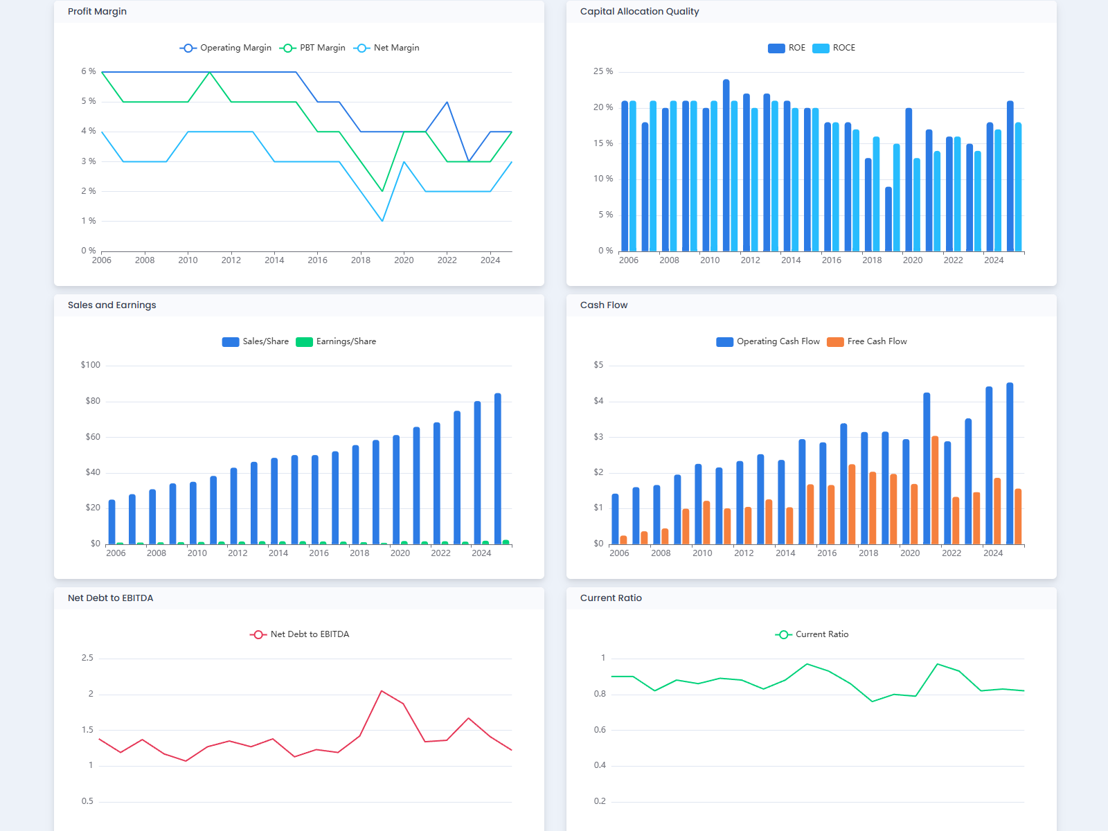 A continually growing page of charts to visually evaluate the company on historical figures and common financial metrics